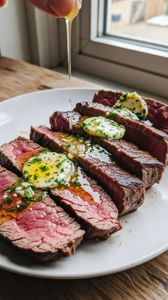 Once your beef is seared, take the skillet off the heat. Slather that beautiful garlic herb butter ALL OVER the top and sides of the tenderloin. Be generous. This isn’t the time to be shy with butter.